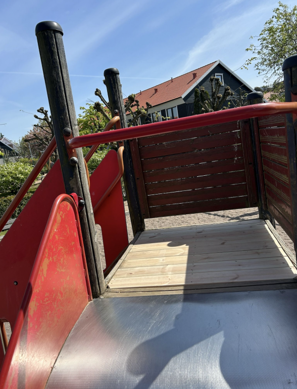 Rutschkanan på stora lekplatsen har fått en ny och förstärkt plattform efter att flera brädor hade knäckts i den förra.